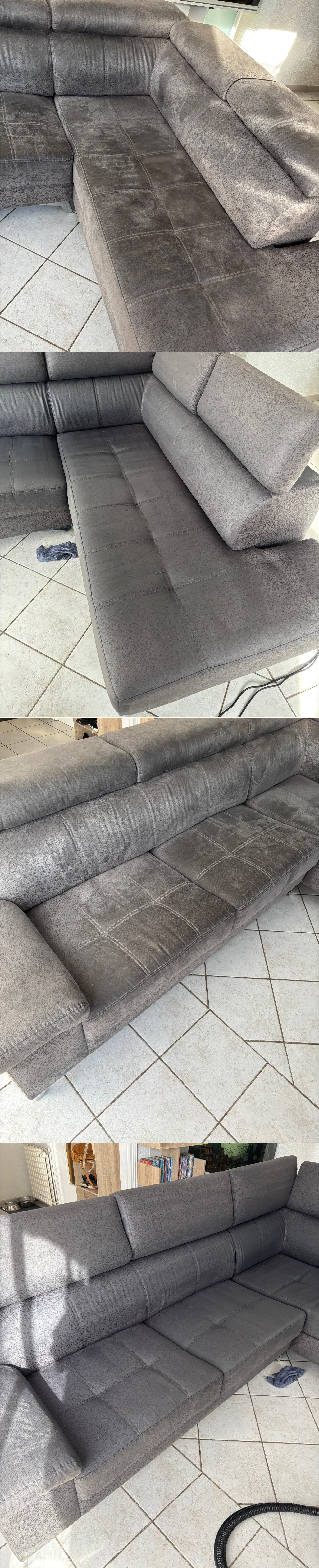 Voici un nettoyage de canapé en profondeur réalisé à La Fare-les-oliviers. Le nettoyage est effectué en trois étapes, l'application du produit nettoyant, le brossage à l'aide d'une visseuse électrique et l'aspiration de la saleté à l'aide d'un nettoyeur injecteur-extracteur professionnel.